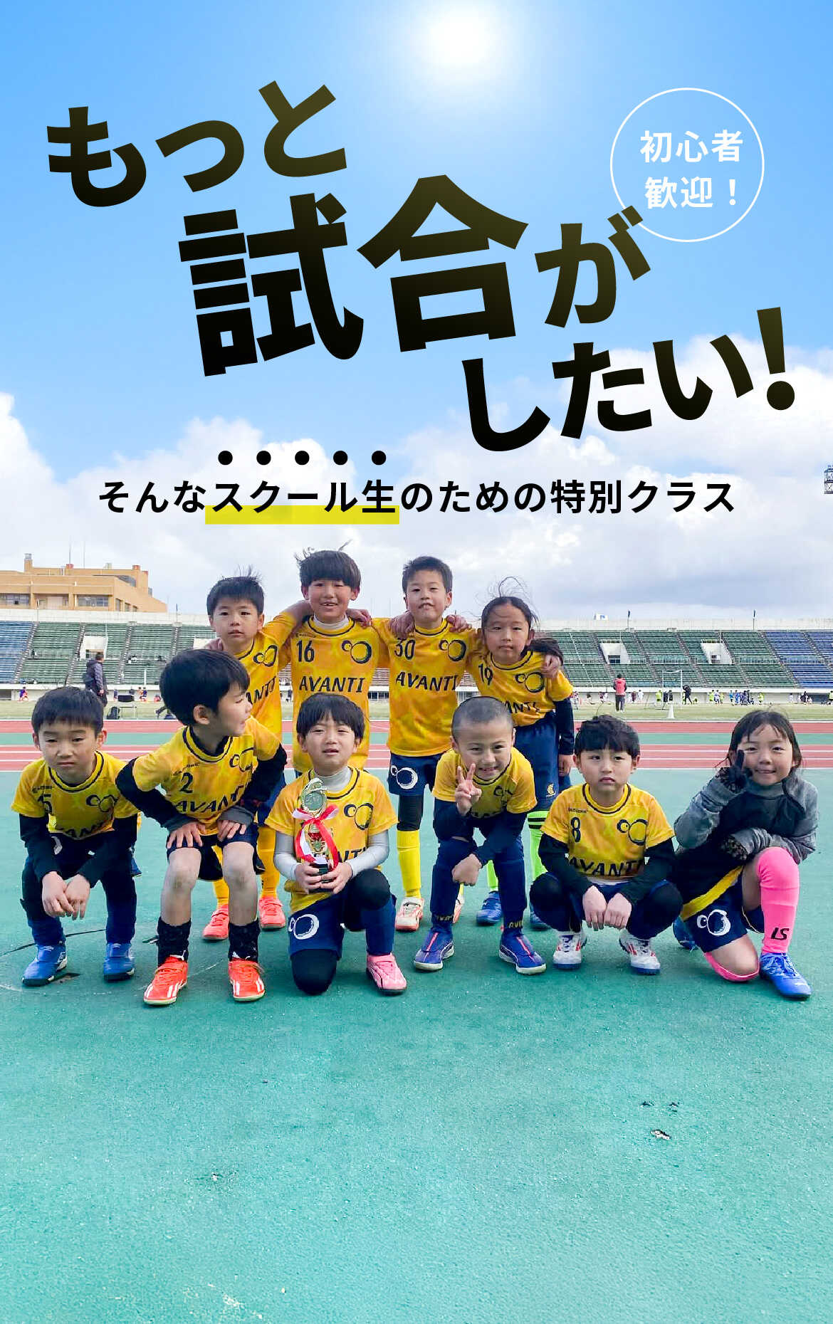 スクール生のままに試合に参加できることが最大の特徴であるAVANTI SSですが、試合は勝ち負けではなく、試合を通じての心身の成長と挑戦を楽しむ気持ちを1番に活動します。